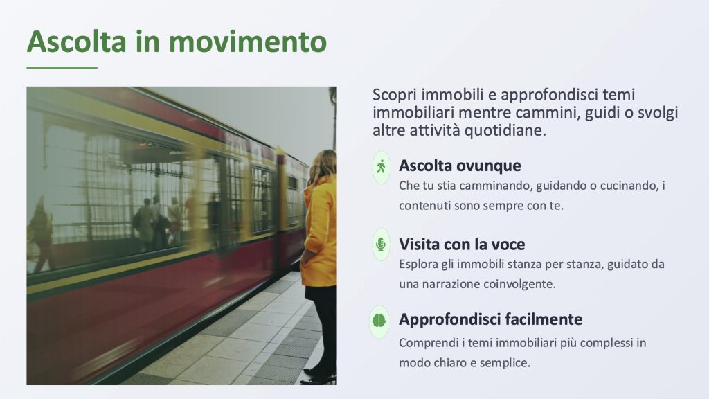Il nostro innovativo podcast ti permette di approfondire la cultura immobiliare mentre svolgi le tue attività quotidiane. Cammina, corri, pedala o fai yoga mentre ti aggiorni sul mercato immobiliare!